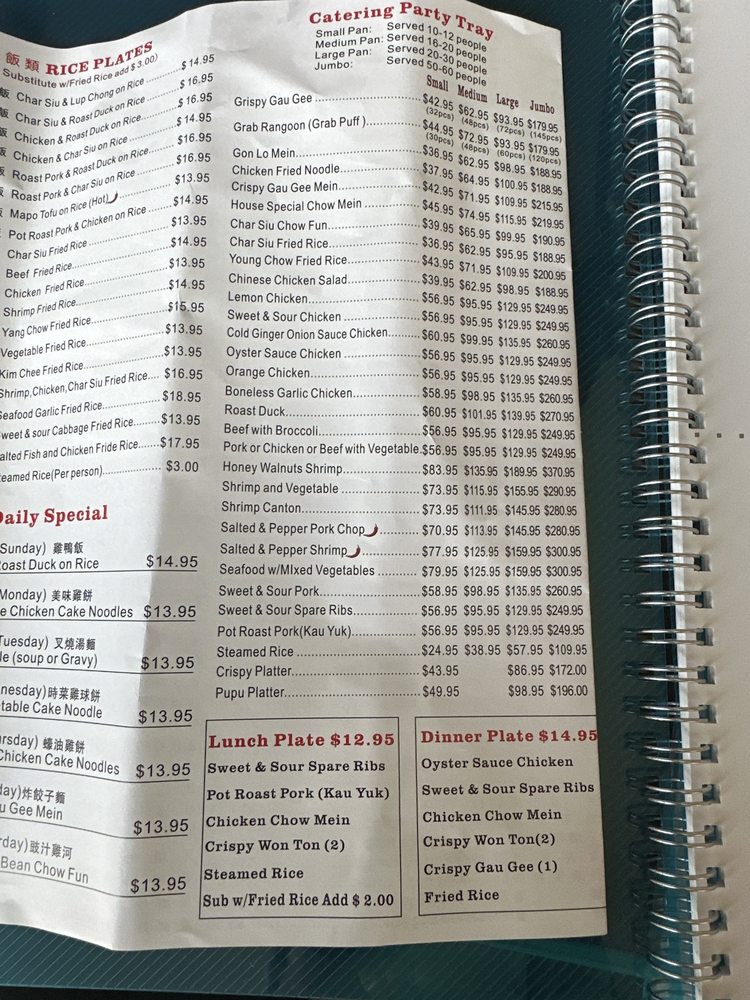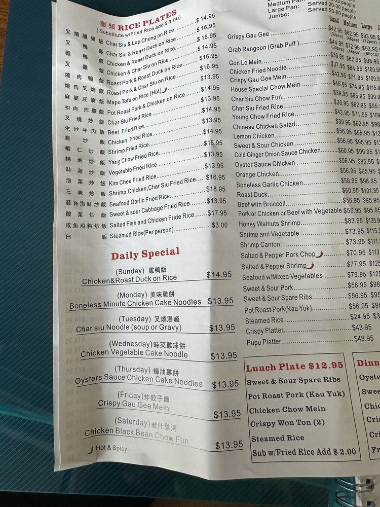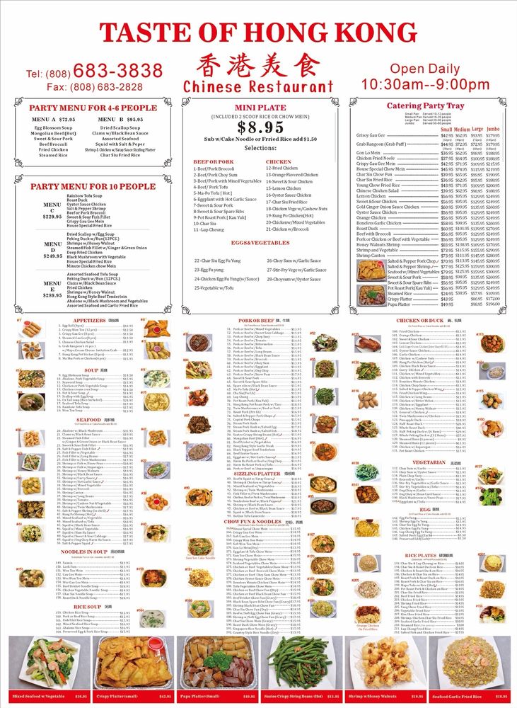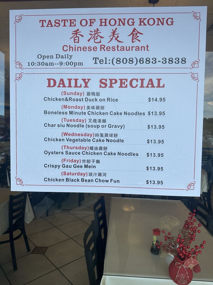 Taste of Hong Kong, located in Ewa Beach, offers a range of Chinese cuisine with options like Chinese Chicken Salad, Crispy Won Ton, Egg Blossom Soup, Seaweed Soup, Roast Duck Soup Noodle, and Beef Brisket with Noodle. Customers rave about the generous portions, flavorful dishes, and attentive service. Highlights include the amazing roast duck noodle soup, packed with tender meat, and the nostalgic Gau Gee Min soft noodle that hits all the right flavor notes. Don't miss the steam fish, which receives high praise for its exceptional taste. While some reviewers mention average service and ambiance, the overall consensus is positive for the quality and taste of the dishes at Taste of Hong Kong. With options for takeout, delivery, and catering, this restaurant caters to a variety of dining needs.